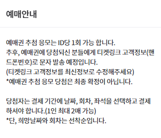 티켓을 카운트 다운으로 해서 선착순이 아니라 기한 내에 응모를 하고 당첨자 명단을 받게 되면 결제를 할 수 있어서 편한 것도 있고 아쉬운 점도 많습니다.