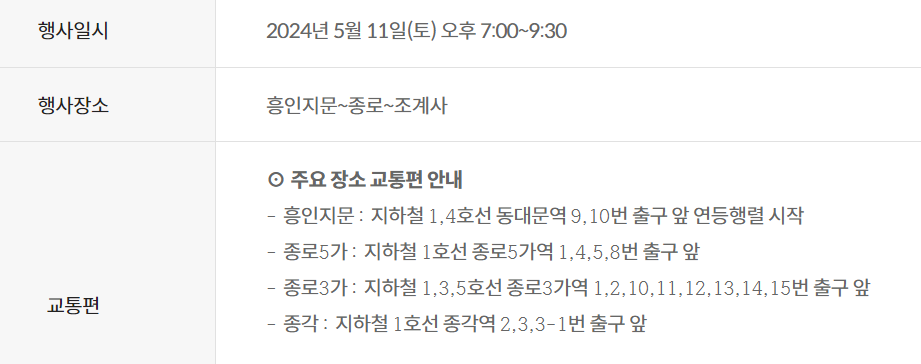 청계천, 열린송현녹지광장, 광화문광장, 조계사, 봉은사 장소마다 다르기 때문에 위치를 확인하셔야 합니다.